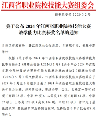 近日,江西省教育厅公布了2024年江西省职业院校技能大赛教学能力比赛获奖名单。本次大赛共有172所学校620支教学团队参赛,我院6支参赛教学团队在大赛中续创佳绩,荣获一等奖1项,二等奖2项,三等奖3项,获奖率100%。