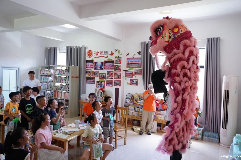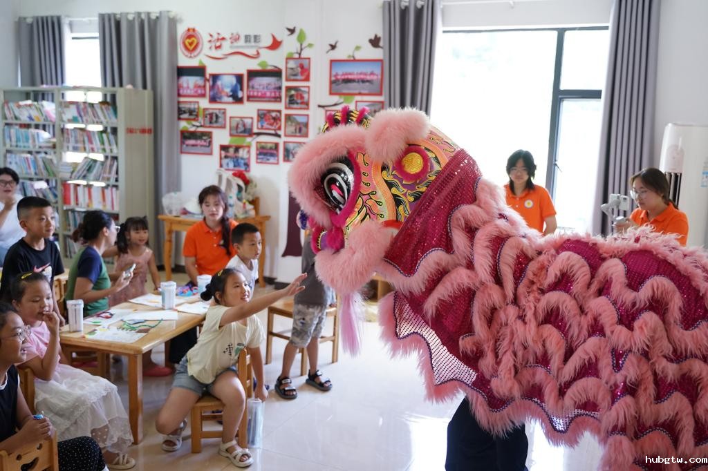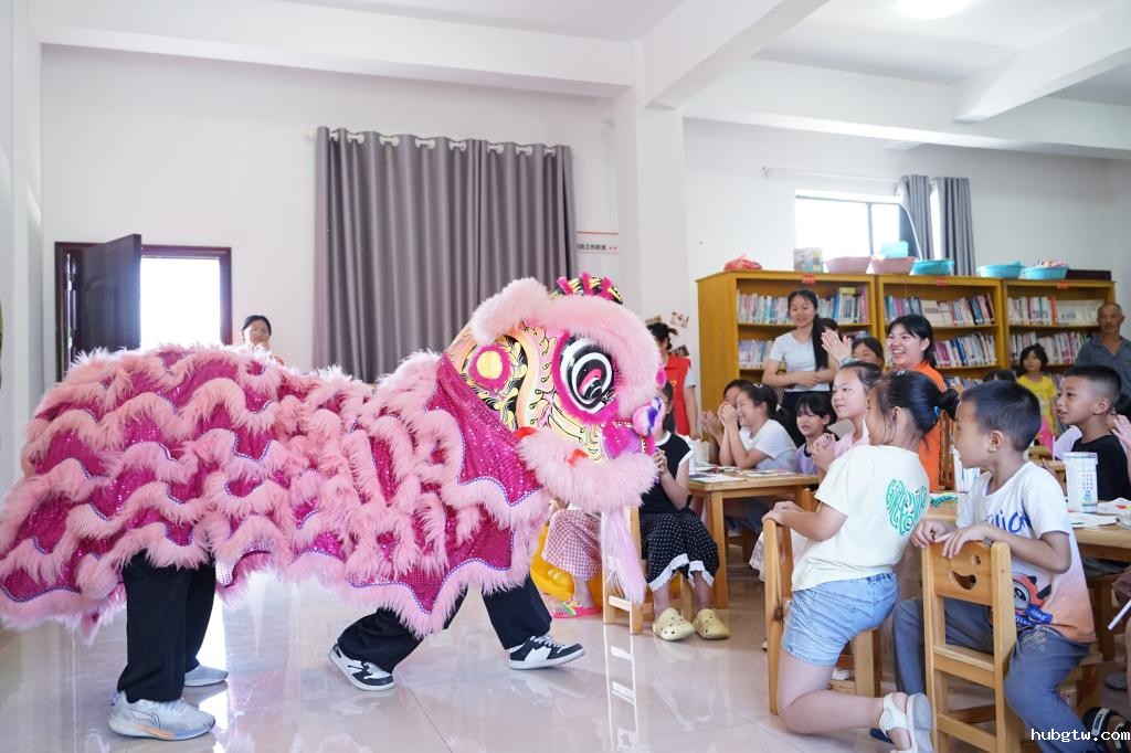 活动尾声,实践队精心准备的“非遗文化大餐”惊艳登场。伴随着激昂的音乐声,威武的醒狮腾空而起,队员们以专业功底演绎“采青”“吐福”等经典套路。孩子们从最初的惊呼躲避,到后来争相触摸狮鼻狮尾,甚至有胆大的孩子钻进狮腹体验“操纵者”的乐趣。当醒狮突然"眨眼""摇耳"与孩子们互动时,整个空间瞬间被纯真的笑声填满,传统文化在代际传递中焕发新生机。