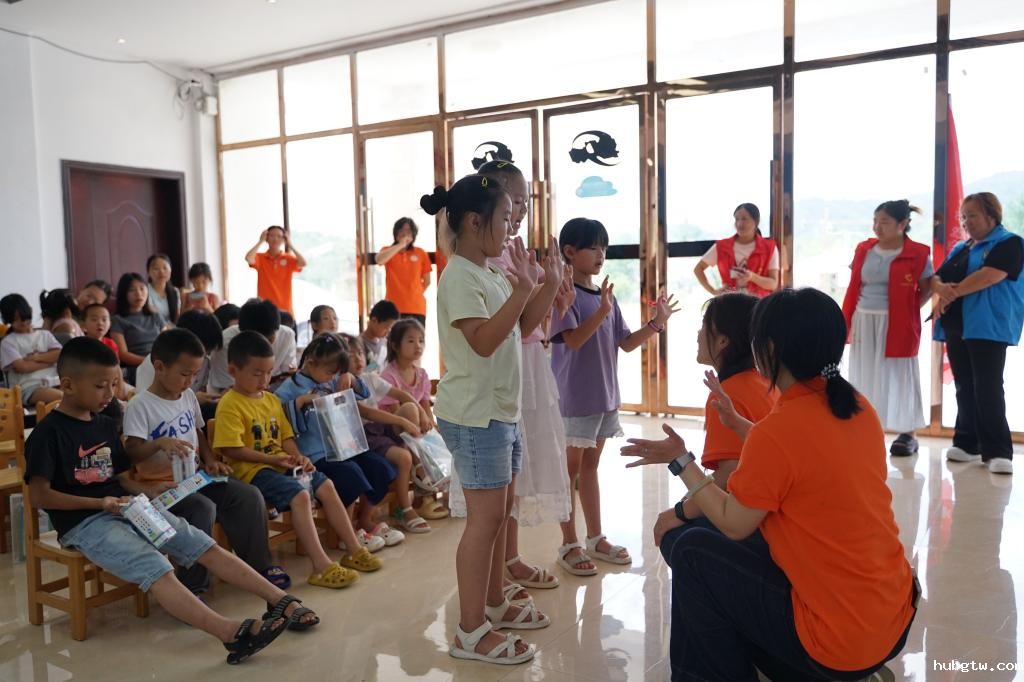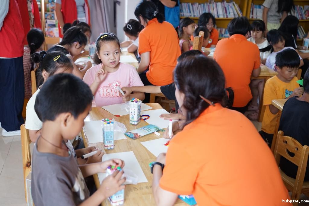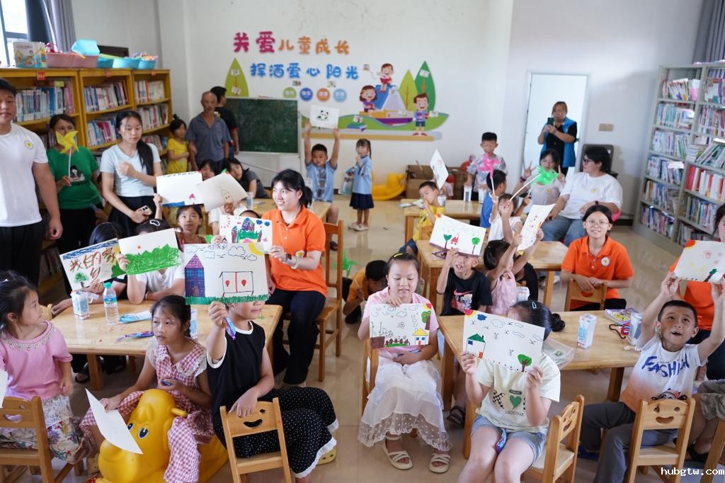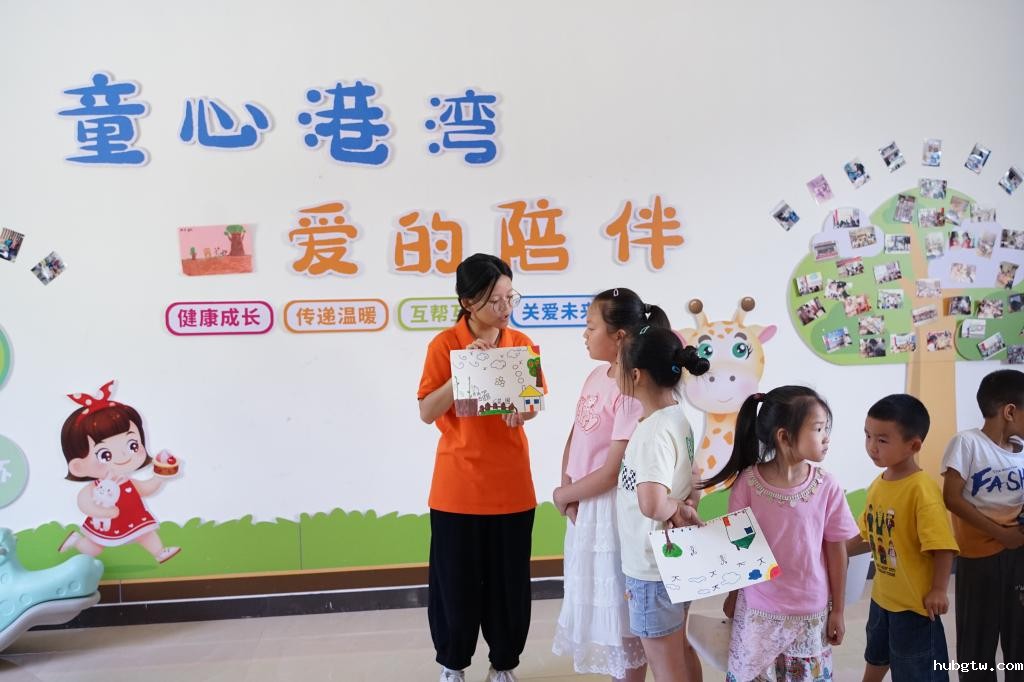 移步童心港湾活动室,一场“我手绘我心”的创意风暴正在上演。实践队员以“心中美丽的家乡”为主题,引导孩子们用画笔丈量乡土。有的孩子用蜡笔勾勒出金黄稻田的丰收图景,有的用水彩渲染出层峦叠嶂的青山远黛。当这些充满童趣的作品在"小小画展"上亮相时,孩子们化身“小解说员”,用稚嫩话语讲述画中故事,眼中闪烁着对家乡的深情与自豪。